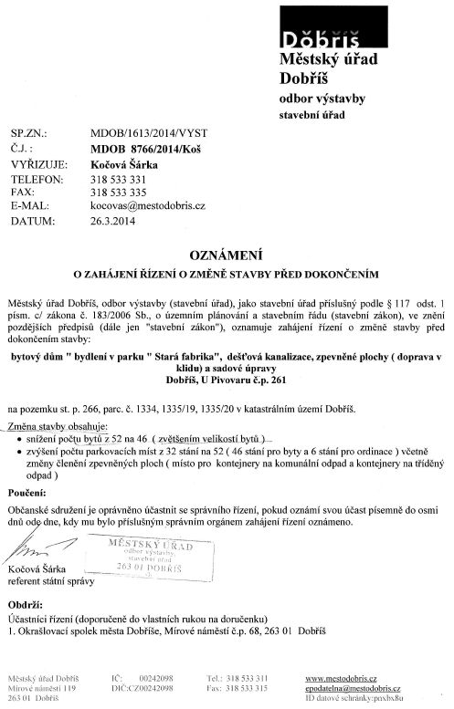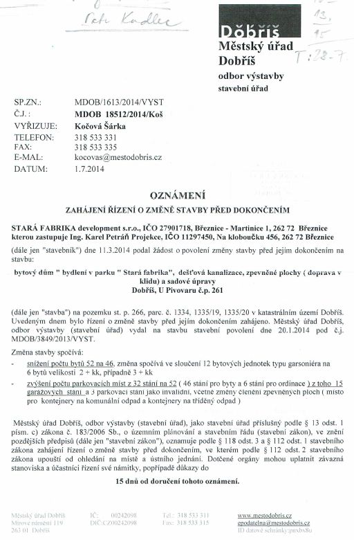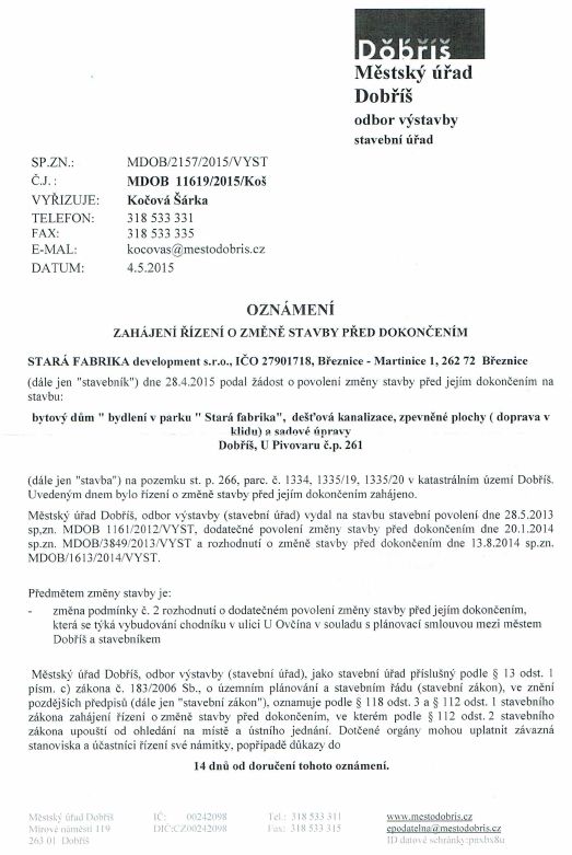 - Oznámení o zahájení řízení o změně stavby před dokončením