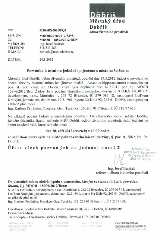 - Pozvánka k ústnímu jednání spojenému s místním šetřením